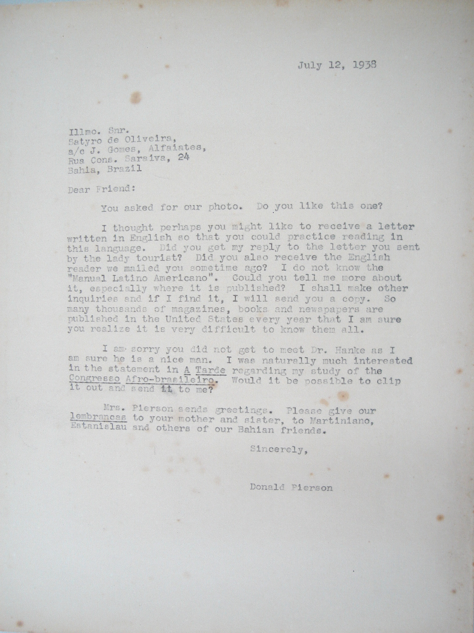 Correspodência para Martiniano Bomfim, remetente Donald Pierson JPG / Tamanho: 780KB | Extensão: 1536X2048
